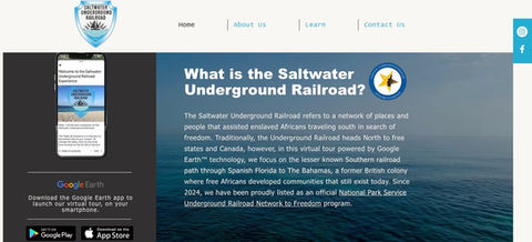The Saltwater Underground Railroad Experience (SURE) is a virtual tour powered by Google Earth™ and website, that retraces the lesser known underground railroad path that enslaved people traveled through Spanish Florida to The Bahamas. The tour currently features 18 related sites and provides links to additional resources including newspaper articles, peer-reviewed and source documents. On the website, visitors can access photos, videos, book titles, and an interactive timeline to further their knowledge of the Saltwater Railroad. Since 2024, we have been proudly listed as an official National Park Service Underground Railroad Network to Freedom program.